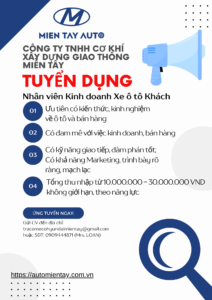 CÔNG TY TNHH CƠ KHÍ XÂY DỰNG GIAO THÔNG MIỀN TÂY tuyển dụng nhân viên kinh doanh MÔ TẢ CÔNG VIỆC: – Giới thiệu và tư vấn bán xe khách 29 – 45 chỗ; – Tìm kiếm khách hàng tiềm năng để giới thiệu sản phẩm xe; – Đàm phán ký kết hợp đồng với […]