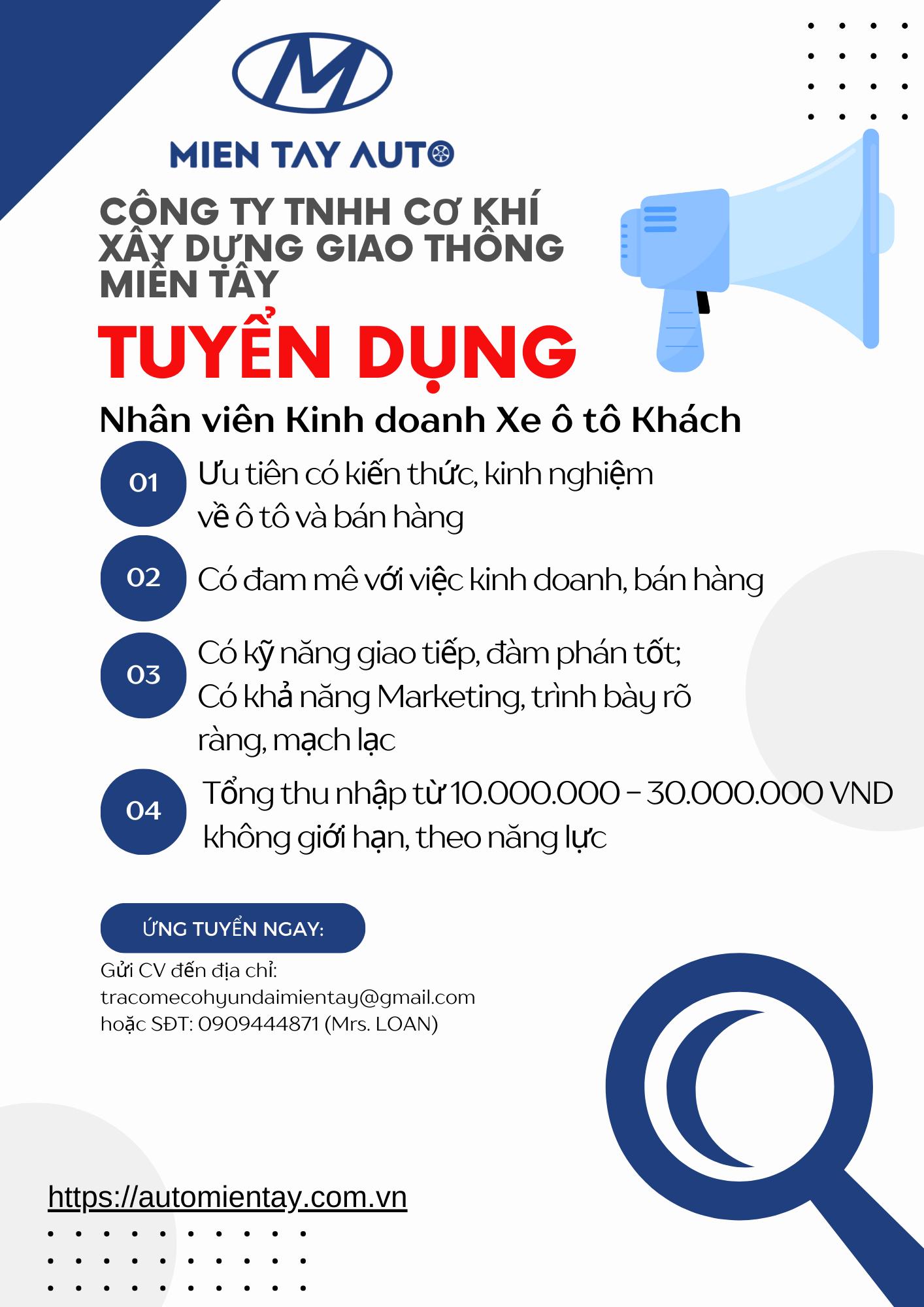 Gửi hồ sơ trực tiếp tại văn phòng công ty hoặc gửi CV về mail: tracomecohyundaimientay@gmail.com hoặc SĐT: 0909444871 (Mrs. Loan)